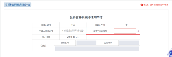 2.点击“立即申请”,填写申请的已接种疫苗名称,点击“正式提交”。