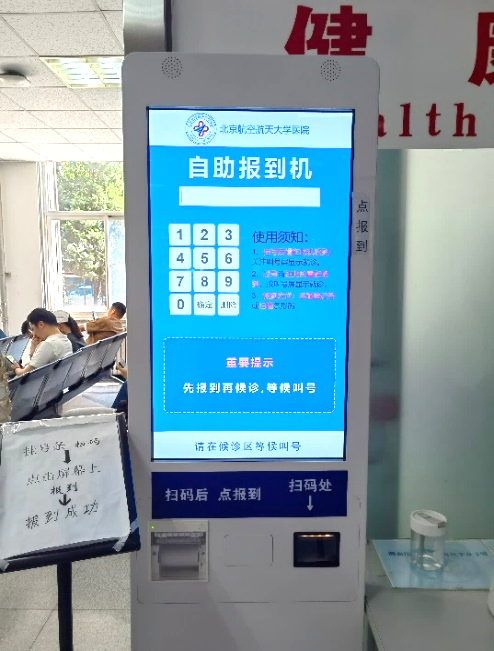 线上挂号缴费成功后,前往医院分诊区在自助报到机上刷系统右上角的“就诊人登记号二维码”报到、候诊(学院路校区口腔科目前无需报到,直接候诊),如过号需要重新报到。北航师生就诊时需出示校园卡或身份证等有效证件验证患者身份。